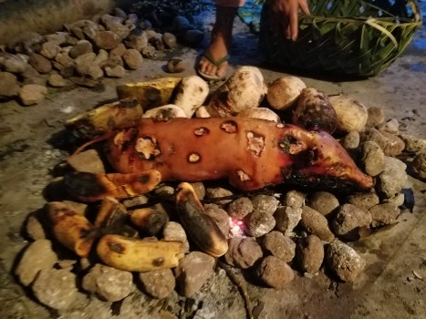 Previous Image Next Image 20170831_183303 Dinner is done. Bananas in front, Size 2 pig in middle, and taro root behind. Photo by Helen.