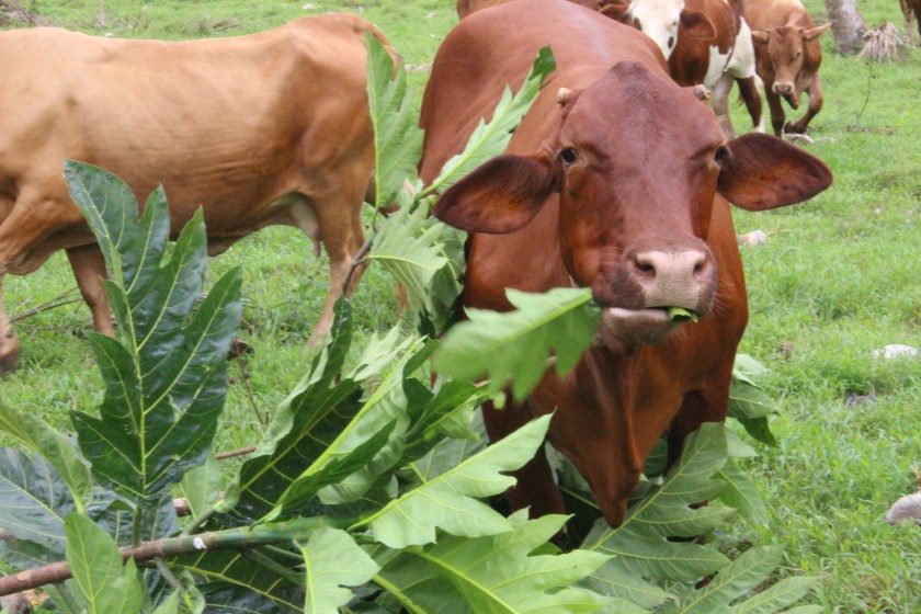 Female cow “Bob”, enjoying breadfruit leaves