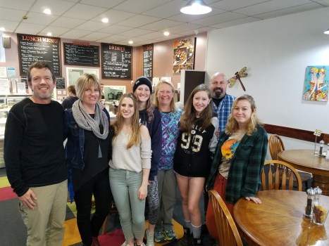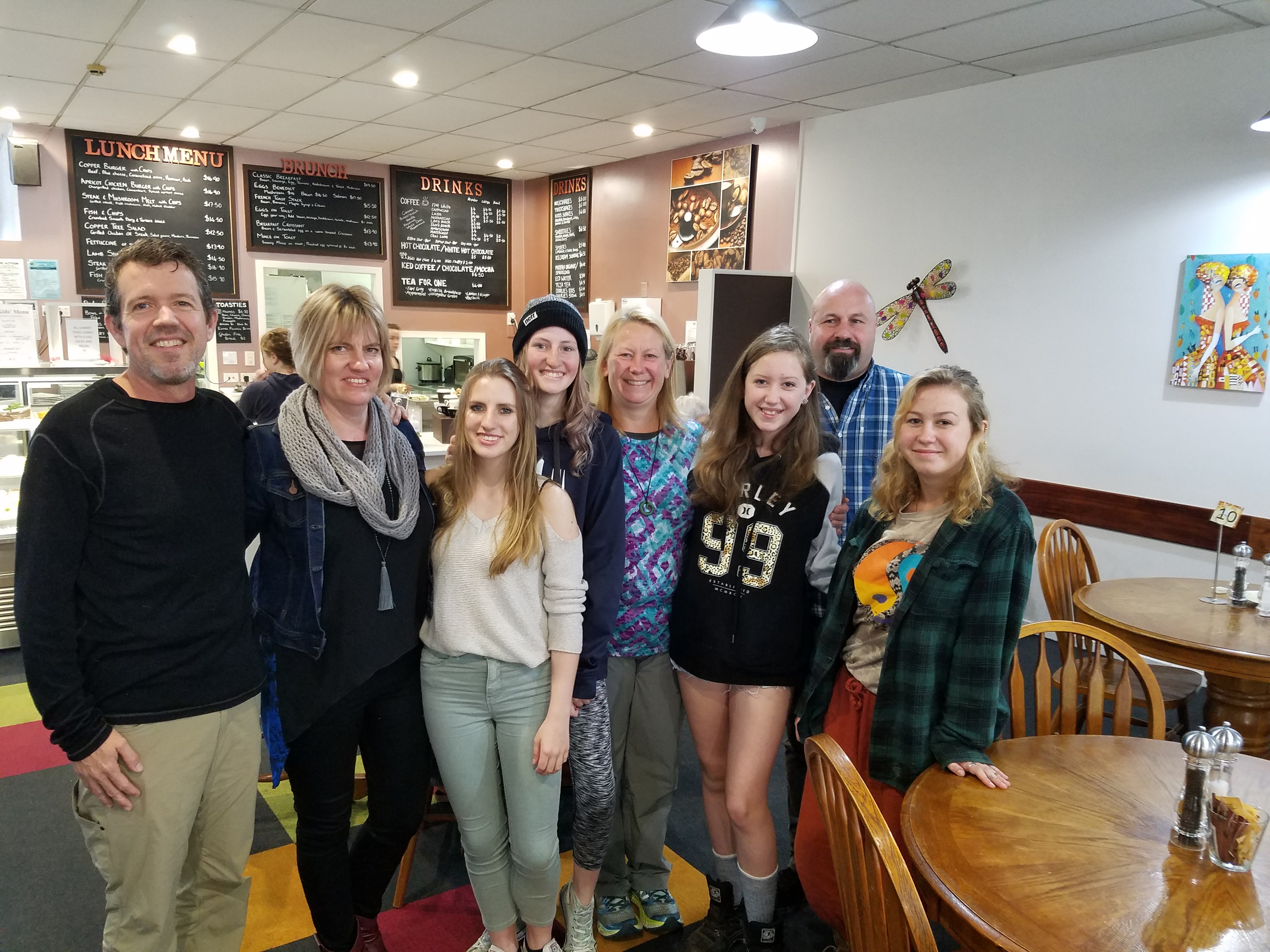 Next Image 20171001_135053 Doug, Raylene, Erin, Megan, Anna, Helen, Nic and Ella at The Coppertree Cafe, Taumarunui, NZ.