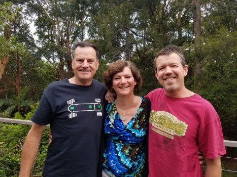 Peter Coe and Annie Kiehn on their deck with Doug.