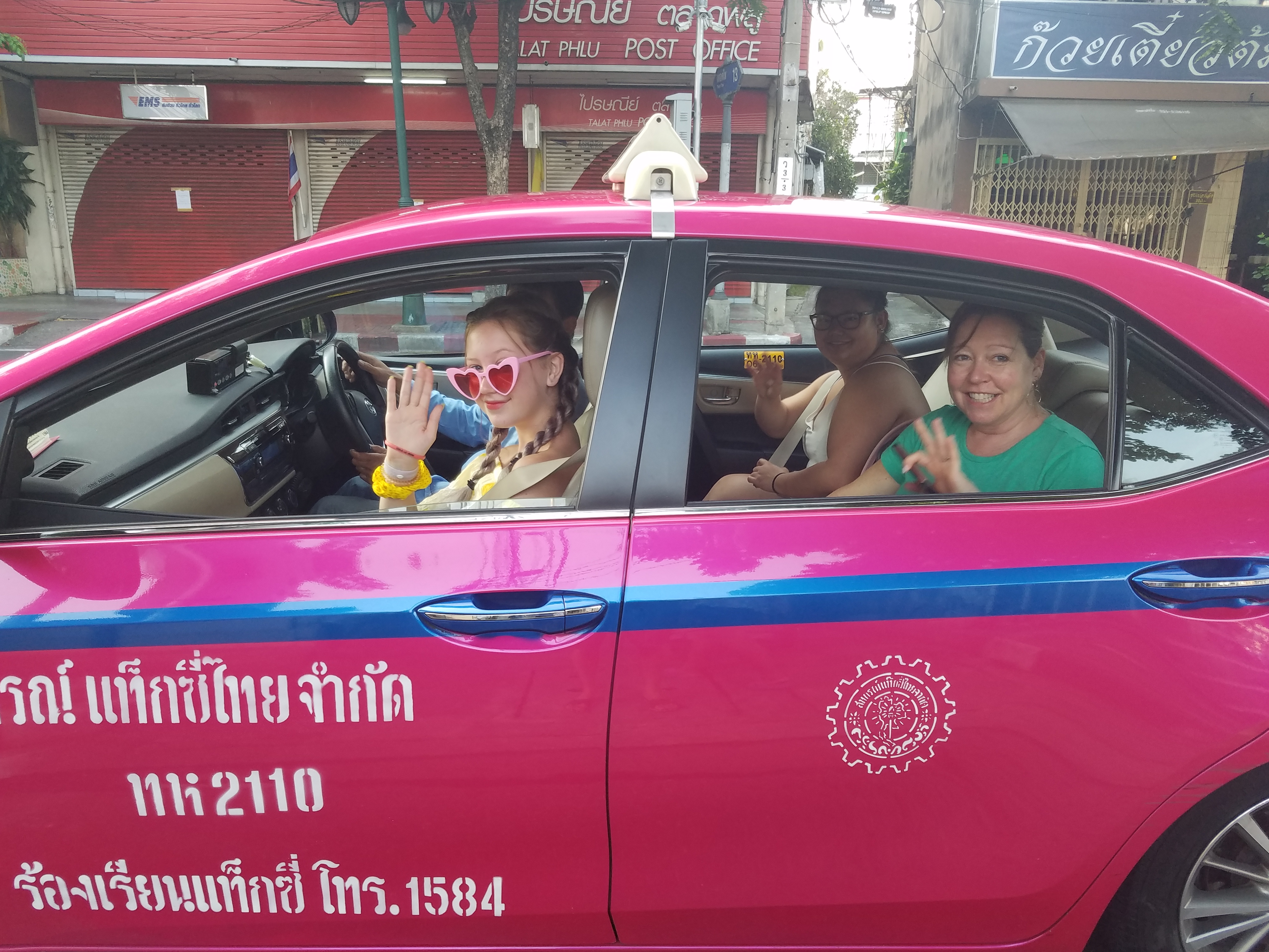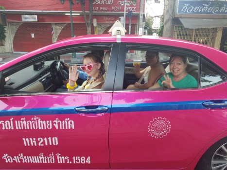 Previous Image Next Image 20180415_070922 Helen, Patti and Madi off to airport in their bright pink taxi!