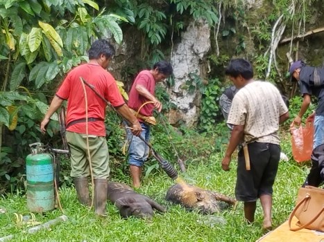 Previous Image Next Image 20180529_122811 After the pigs are killed and before they are butchered, the hair is scorched off