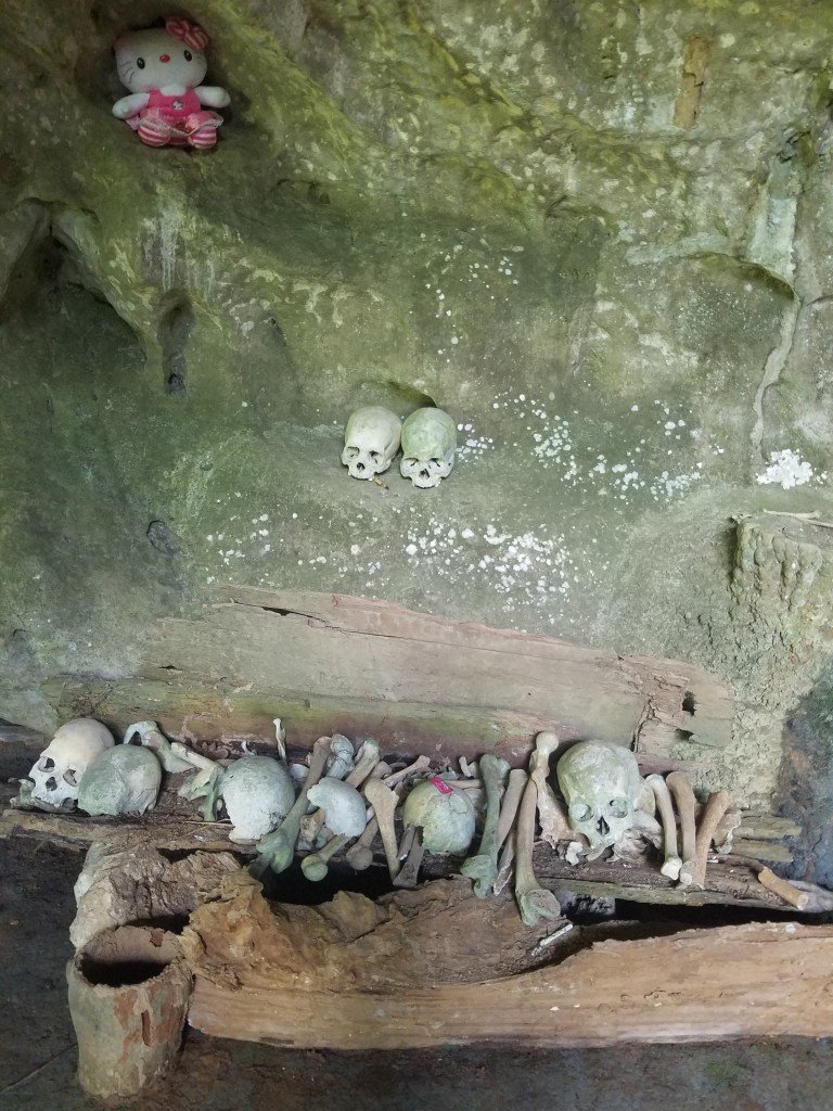 Previous Image Next Image 20180530_112747 A Hello Kitty offering for the deceased. Our guide explained that sometimes people have a dream, or get a message that the deceased needs something, and perhaps a young spirit asked for a toy. We liked the contrast to all the skulls!