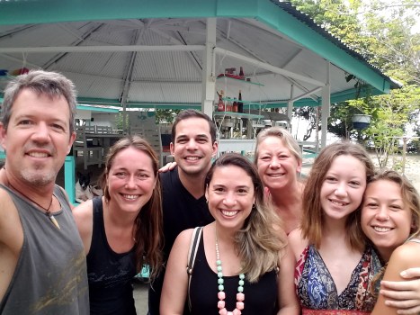 Previous Image Next Image 20180616_075649 Us all puffy faced from diving, with dive master Dana and new friends Philip and Renatinha from Brazil